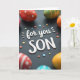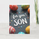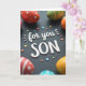 This card features the words “for you SON” in raised white letters centered on a deep charcoal-gray background, with the message feeling like a close, affectionate note meant for someone special 🐇. The lettering is crisp and three-dimensional, drawing your eye straight to the middle while the surrounding decorations sit slightly out of focus. Around the text are several egg-shaped decorations in rich red, green, yellow, and orange, arranged like a thoughtful ring that frames the dedication. Some eggs carry polka dots while others have stripes, and their softened edges give the scene a gentle, tender look, like a quiet celebration shared between family or close friends 🌷. Small round confetti pieces are scattered across the dark surface in matching colors, filling the space with light, festive detail without crowding the message. The lighting is subtle and directional, bringing out the texture of the raised letters and the matte background while leaving the outer decorations softly blurred. The white text sits squarely in the center, with the colorful eggs and tiny dots spread around it in a loose, balanced flat-lay arrangement.