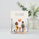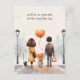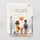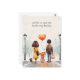 Ett snyggt vykort i bakgrunden med en illustration av en söt skolflicka som håller händer med sina föräldrar och med anpassadet "Vi kommer att vara på din sida för första dagen!". Det finns också en valp som åtföljer familjen.