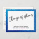På framsidan av det här enkla vykortet finns ett grafikhuvud som jag designat med hjälp av en handskrift för avslappnad, som lyder "Ändring av planer". Nedre, det finns ett glatt meddelande som du kan redigera och som förklarar dina nyheter: "Vi är fortfarande Gifta sig, nu är vi helt osäkra när!.." Gräns uppnåddes med hjälp av en lysande, ljusblå faux glitter-grafik med en vit rektangulär övertäckning. På baksidan finns mallplatshållare för information. Använda dessa fält att lägga till era personuppgifter och ändra mitt förslag till formulering till kostym för era behov och er situation.