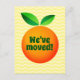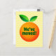 Vi har flyttat nyare adress, söta, moderna orangens fruktannonseringsvykort. Lägg till din nyare adress på baksidan. Fruktigare färgstark rand-kortsdesign med - med elegantens penselskripttypografi. Cute change of adress-kort för vänner, familj, företag, företag, butiker, lantbruk etc. Gultens orange och grönt färger.