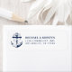 Nautiskt blå och vit bröllops returadressetikett. Perfekt för ett Navy (militärt) eller sjöhusbröllop. Designen har ett ankare insvept i ett banderoll med texten "Förankrad i kärlek". Personifiera den med din bröllopsinformation.