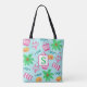 Personifiera denna förberedda strandscen väska med en initial och ge den som en gåva eller förmån. Denna strandscen med strandväskor, bikinis, palmträd, solglasögon, strandväskor och strandhattar finns på andra produkter i min butik, PageCreativeDesigns.