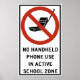 Vägskylt som visar att handstyrd cell telefoner inte får användas på en zon i skolan.
