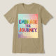 Den här inspirerande t-shirt-designen innehåller frasen "Embrace the Journey" i fet, konstnärlig text, parad med ett scenmotiv - dvs. rullande vägar, berg eller ett stigning sol - som symboliserar personlig tillväxt och äventyr. Perfekt för drömmare, resenärer och vem som helst som med mod och syfte navigerar i livets väg.