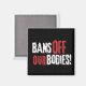 Visa ditt stöd för kvinnors rätt till kroppslig autonomi med denna öppen-val-magnet med texten "Bans Off Our Bodies" i grunge-stil vit och röd font på svart bakgrund.