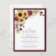 Låt dina gäster veta att ditt bröllop har blivit försenat med detta eleganta, moderna solros- och burgunderfärgade blomsterbröllopsdatum för förseningsmeddelande med handmålade akvarelldetaljer och handskrivna typsnitttyper. Copyright Elegant Invites, alla rättigheter förbehållna.