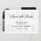 Detta förenklade spara-till-datum-meddelande för vita och svarta bilder fångar enkelhetens kärna med en aning sofistikering. Den här designfunktionen Spara datum i ett fet streck med böjd färgad med en kombination av stif- och skriptteckensnitt på en vit bakgrund på framsidan och ett foto med ett svart, enkelt geometriskt mönster på baksidan.