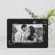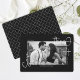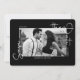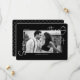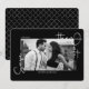 Detta förenklade svartvitt spara-till-datum-meddelande fångar det centrala i enkelhet och sofistikering. Med fotot omgivet av ett svart ram, seriöst och kursivt teckensnitt på framsidan och ett svart och vitt geometriskt, prickat diagonalt mönster på baksidan.