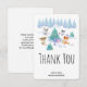 Tack för ett kort med en vismisk skogsscen. Lycklig-skogsdjur som dansar runt en grönt träd med presenter under. Lycklig och glatt vattenfärgsdesign.