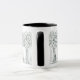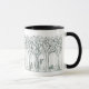 Ett vinterkaffe mugg med en svart penna och bläck teckning i en skog med trädjur inklusive kaniner och en hjort i snö.
