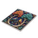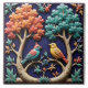 Keramiskt plattor med två färgfåglar i en skog, sitta på färgstarkt stiliserat träd, på mörk blått bakgrund.