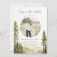 Fotografiet Christian bröllop spara datum skildrar en enkel vattenfärgsdesign som omfattar gräs och berg i träd i jordens tonnyans, sage, grönt och tan. Baksidan har inspirerande citat från bröllop: "Två liv förenade i vänskap, Två vänner förenade i kärlek, Ett kärlek förenade i Kristus."