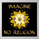 Guld och brons lotus med lila och violetta högdagrar och ett lila fredstecken i mitten ber dig att "Imagine No Religion".