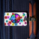 Föreställ fredsymbolet och ljus Retro blommaiphone case och elektronikcases, förkläden, nyckelringar och knäppas. Konstnär som är designad i ljusa djärva färger för nyckfulla och roliga gåvor.