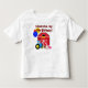 Småbarn Farm 3:e födelsedag t-shirt med rödhö, blå traktor, gris, kyckling, ballonger och text som lyder "Firar min 3:e födelsedag!".