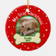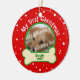 Denna prydnad för personligbildhunden har rum för ditt husdjur beställnings- foto. Ovanför den något att säga, "min första jul.", Nedanfört har den ett ben med utrymme för ditt husdjur namn och år.