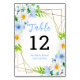 This beautiful and elegant wedding table number sign features watercolor blue forget-me-nots, daisies and foliage on a gold geometric frame. The text combines handwritten script and serif fonts for a stylish and modern look. This is perfect for a spring or summer rustic wedding.