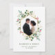 Det här vackra julkortet för nygifta har ert eget bröllopsfoto, omgivet av en falsk guldgeometrisk ram med matchande gula blad, julgrönska och röda järnekbär på en modern vit bakgrund. Elegant text säger "Gifta & Glada."