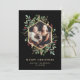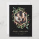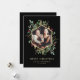 Det här vackra julkortet innehåller ditt eget personliga familjefoto, omgivet av en falsk guldgeometrisk ram med matchande gula blad, julgrönska och röda julholberry på en modern svart bakgrund. Elegant text säger "God Jul", men du kan ändra detta till din egen lyckliga högtidshälsning.