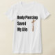 Denna kristna design har en bild av Jesus på kor. Ordstävnågot att säga "förkroppsligar piercing sparad mitt liv" avbildar egendomen av flitig hjärta