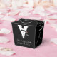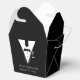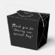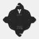 Tuxedo-designen har utseendet av en smoking som bakgrund till din information, inklusive namnen på paret, datum för bröllop och ett speciellt meddelande med tack på baksidan. Allt i ett dekorativt teckensnitt.