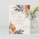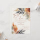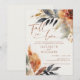 En romantisk, elegant, klassisk och modern inbjudan för en förlovningsfest under höstmånaderna - september, oktober, november. Den har modern, elegant skrivstil kalligrafi och titeln "förälska dig" och ett rustikt, chic botaniskt arrangemang av höstlöv med en terrakotta, bränd orange och blå färgskala. Lyxigt men enkelt, klassiskt men chic, modernt men tidlöst. Ett vackert val för en höstförlovningsfest med koppar, bränd orange, terrakotta, beige, röd, orange och andra höstfärger.