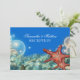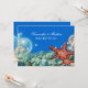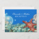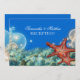 En platta 5x7-tums mottagningsinbjudan med en vacker design av stjärnfisk från orangen omgiven av blåa och elfenbensbubblor/krämbubblor mot ett tårhav golv.