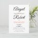 Inbjudan till förlovningsfest av enstaka blommigtar för handskriven typografi. Den visar namn i ett kursivt skript med handskrivet stil-typografi och två små korallpersikor med grönt löv på båda sidor om storytan. Baksidan innehåller ett blommönster.