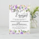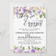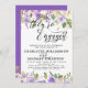 Fina ultraviolett ro blandas med grå vita blommor för att skapa en vacker blommigt. De är upptagna i ett stort skript. Återstoden av texten är ett klassiskt serif-teckensnitt. Baksidan av inbjudan är lika söt som framsidan. Det är en lila av rikens royal med de små vita prickarna. Blommigtens utformning framifrån fortsätter på baksidan. Texten är enkel att anpassa.