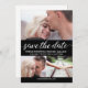 Anpassa med egna foton på det här platta bröllop-kortet "Spara datum". Meddela din förlovning och anpassa texten med dina kommande uppgifter om bröllop. Anpassa det här platta kortet för förlovning i bröllop med tre foton från fotobilden i förlovningen, namn, plats och datum i bröllop. En svart pub vid grund har också fält för er webbplats bröllop. Elegant och modern skripttypografi på svart. Gratulationer! Berätta om du behöver hjälp med den här utformningen på info@lddesignloft.com.