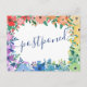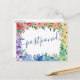 Meddela dina gäster att bröllopet har blivit uppskjutet och ge dem ett nytt datum eller länken till din hemsida för mer information med detta färgglada vykort med en ram av blommor i regnbågens färger där 'uppskjutet' skrivs över ändra datum-kortet i ett charmigt mörkblått handskrivet typsnitt. På baksidan kan du skriva den nya informationen och under ett litet hjärta era namn i ett vackert typsnitt.