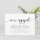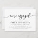 Inbjudan till Förlovningsfest av snyggt med ord "Vi är engagerade" i ett slappna av, kursivt skript i svart mot en vit bakgrund. Kortet har en svart baksida med överlappande vitt linjer. Anpassa den genom att ersätta platshållartexten. Om du vill ha fler alternativ som att ändra teckensnittet och det är storlekt/färg eller mellanrummet mellan brev klickar du på knappen "Anpassa". *Observera att Zazzle Watermark som visas i zoomförhandsvisningen INTE visas på den färdiga tryckta produkten. © Rosewood and Citrus