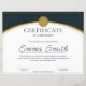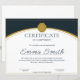 Designed for the modern workplace, this certificate features a stunning color palette of deep navy blue and metallic gold. The design includes a prominent gold wax seal emblem at the top, elegant curved gold lines, and a clean white center for maximum readability. The recipient's name is displayed in a beautiful, flowing black script font (shown as "Emma Smith"), adding a personal and prestigious touch.