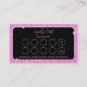 Behålla ditt varumärke och dina kunder med det här Modern Chic Rosa Glitter Loyalty Card. Det här kortet är designat för snyggtens skönhetsalternativ och har en god bakgrund för rosa glitter och en ren, minimalistisk layout som är enkel att anpassa. Perfekt för nagel techs, lash artists, hårstilist och andra salonägare. Med det här förmånskortet kan du belöna upprepade kunder med erbjudanden, rabatter eller kostnadsfria tjänster. Ett glamoröst men ändå professionell sätt att bygga varumärkeslojalitet och lämna ett varaktigt intryck.