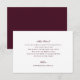 Ett formellt burgundtfärgat kuvertkort med en skarp vit framsida med burgundtfärgad skrivstil och seriffer, tillsammans med en rik burgundtfärgad baksida för en klassisk, samordnad look för brölloppsutskriften. Detta eleganta informationskort är utformat för att hålla extra information till gästerna tydlig, polerad och vacker.