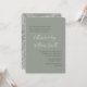 Vi presenterar Sage Grönt Simple Elegant Calligraphy Formal bröllopsinbjudan, ett tidlöst biet som sömlöst blandar traditionell charm med modern elegans. Mot bakgrund av en sund grönt uppmanar man presenter att formulera sig på ett mycket bra sätt, och att i första hand se till att brudens föräldrar namn, symboliserar respekt och familjesammanhållning. Parets namn är skrivet med snyggt i modern kalligrafi med vit bläck och skapar en slående kontrast, medan resten av detaljerna är noggrant tryckta i svart elegant, vilket garanterar tydlighet och sofistikering. Den omvända sidan av inbjudan avslöjar ett utsökt, handritat botaniskt mönster, som tillför ett inslag av naturskönhet och som kompletterar trädgård, utomhus och grönt bröllop under vilken säsong som helst. Den här inbjudningens harmoniska palett i färg och design visar lugn och elegans och lovar att ange tonen för din speciella dag med dess underskattade elegans.