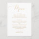 Visning din mottagningsmeny i tidlös elegans med det här formella bröllop-menykortet. Med ett snyggt skript med guld-utseende parat med klassiskt serif typsnitt på en vit bakgrund visar det på ett snyggt sätt kurser i en ren, sofistikerad layout. Den tryckta guld-effekten ger ett utseende av metallisk skorpa - ingen folie behövs. Anpassade för att matcha måltidsinformationen. Kortet är idealiskt för uppskalning, modernt eller minimalistiskt bröllop.