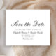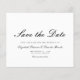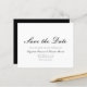 Den här snyggtens formella bröllop spara datum-kort har elegant svart skript och litet stort typsnitt på vit bakgrund. Baksidan är helsvart.