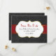 Elegant Spara datum bröllopsannonsering, med vacker grafisk bakgrund, av en svart på svart damastdesign. Grafik av ett rött och guld band löper tvärs över mitten, med en vacker guldton och vit plakettstil textområde. All text är anpassningsbar för att passa dina behov. Underbar sätt att meddela dina kommande bröllopsplaner. Vackra matchande kuvert finns tillgängliga, se länk nedan.