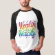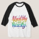 T-tröjan skryter med texten "Förmögen and Wacky" i ett dynamiskt regnbåge i färg. Varje ord skulle kunna vara ett fast färg från regnbågen, med "Förmögen" som kan skrivas i fet, klassisk regnbågsordning (rött, orange, gult, grönt, blått, indigo, violett) och "Wacky" med hjälp av en lekfull, omvänd ordning eller en mer vismisk arrangemang av regnbågen färger.