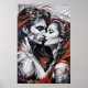 En intensiv kyss mellan två fasetterade, geometriska ansikten—hud bruten i plan av ljus och skugga—medan karmosinröda band flyter som blod, passion eller öde. Den skarpa kontrasten mellan monokrom och livfull röd skapar dramatisk spänning. Ett kraftfullt konstverk för mode, film, litteratur eller känslomässigt resonant lyxvarumärke.
