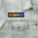 Denna roliga, vibrerande mångfärgade namn brickadesign presenterar allmänningförnamnet "ALEXANDER", med breven av namn som har ett färgrikt mönster för färgläggning för lutning för regnbågespectrumnågot liknande, på en svart kulör bakgrund. En nametagnågot liknande denna styrka ha på sig av anställd, en volontär eller en representativ kundtjänst vars tilltalsnamn är Alexander, för att hjälpa att identifiera weareren till andra. [~Z0000344]