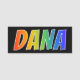 Denna roliga, vibrerande mångfärgade namn brickadesign presenterar allmänningförnamnet "DANA", med breven av namn som har ett färgrikt mönster för färgläggning för lutning för regnbågespectrumnågot liknande, på en svart kulör bakgrund. En nametagnågot liknande denna styrka ha på sig av anställd, en representativ kundtjänst eller en volontär, som namnges Dana, för att hjälpa att identifiera weareren till kunder eller annan folk. [~Z0000344]