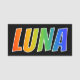 Denna roliga, vibrerande mångfärgade namn brickadesign presenterar allmänningförnamnet "LUNA", med breven av namn som har ett färgrikt mönster för färgläggning för lutning för regnbågespectrumnågot liknande, på en svart kulör bakgrund. En nametagnågot liknande denna styrka ha på sig av en stabsmedlem, en volontär eller anställd vars förnamn är Luna, för att hjälpa att identifiera weareren till kunder eller annan folk. [~Z0000344]