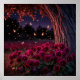 En magisk utomhusscen med vibrerande lila blommor under ett träd med lysande eldflugor, mot en stjärnfylld nattfylld himmel. Radierar en känsla av lugn, skönhet och .