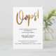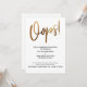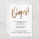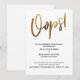 Denna svits utmärkande beror på det moderna, handskrivna typsnittet som används för accentfraser. I denna del användes det handskrivna typsnittet för att skapa en enkel grafik som läser "Oops!", stor och fet. Grafiken har förstärkts med en falsk-metallisk slät guld effekt som ger en festlig stämning. Malltextens formulering i min platshållartext är riktad mot ett bröllop som skjuts upp, men om din händelse ställs in kan denna design också tillgodose det behovet. Använd mallfälten för att lägga till dina personliga detaljer och gör denna unika, moderna design till din egen, med vilken formulering som passar dig! Bakgrunden kan ändras till valfri färg du föredrar. Vänligen hör av dig med eventuella specialförfrågningar eller för anpassningshjälp. //