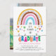 Modern fotoförskoleavslutningsfest inbjudan. Designen har en färgglad regnbåge med hjärtan, typsnittsmanus '' examenstudent '' i trendiga bokstäver och festdetaljer på framsidan och ett foto på baksidan.
