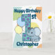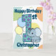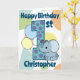 En bedårande födelsedagskort för att fira ditt barns första födelsedag. På framsidan av kortet finns en stor siffra ett i blått med lila prickar. Ovanför siffran står orden 'Happy Birthday' i blå bokstäver. Under siffran finns en mall också i blått för att lägga till ditt namn. Framför siffran står en söt tecknad grå elefant. Och bakom siffran finns två ballonger, en i blekt blått och en i blekt gult. Bakgrunden är vit med former i bleka färger av blått, grönt och orange. Inuti kortet finns en mall för att lägga till ditt eget personliga födelsedagsmeddelande.
