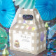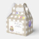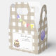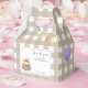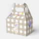 FÅNIGET GÅR. Vattenfärgen barns födelsedag party. Vaterfärgssöt gås i födelsedagshatt, tårta med bär, lila ballong, flaggor festliga trädgård. Beige-brun burbakgrund.
