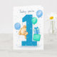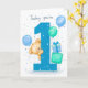 Cute björn med en stor brev och blå present och ballonger för att fira hans första födelsedag.